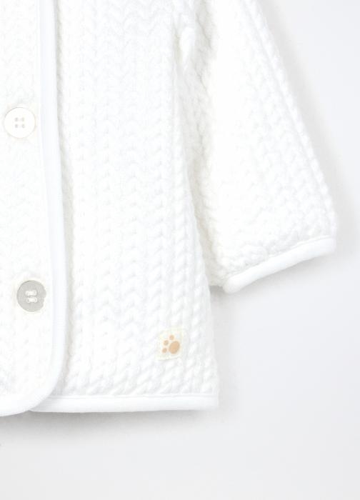 Ovaj mekani velur kardigan u bijeloj boji savršen je za zimske dane. Izrađen od pletenog materijala, pruža toplinu i udobnost za novorođenčad. Dostupan u veličinama 1-3, 3-6 i 6-9 mjeseci.