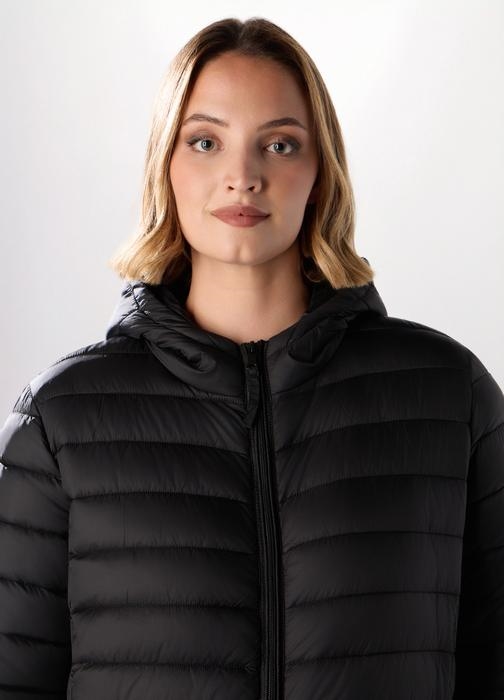Ova crna podstavljena jakna s kapuljačom idealna je za jesenske dane. Izrađena je od tkanog materijala koji pruža toplinu i udobnost. Namijenjena je ženama koje traže stil i funkcionalnost.