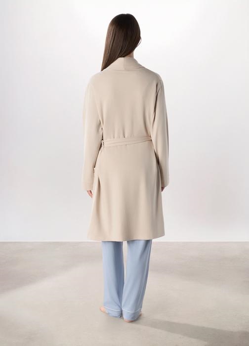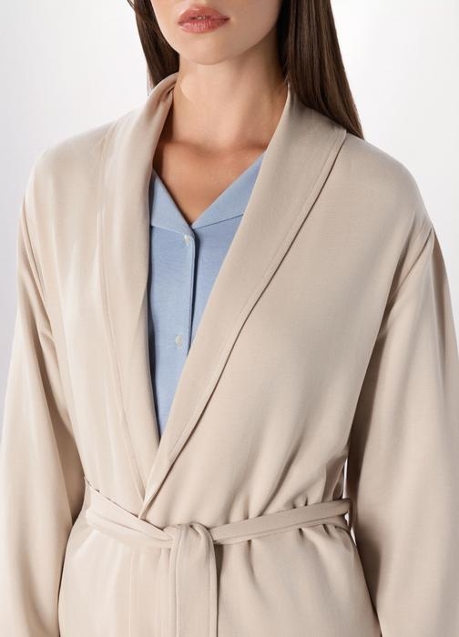 Ovaj mekani ženski kućni ogrtač izrađen je od pletenog materijala, savršen za jesenske večeri. Siva boja dodaje eleganciju, a dostupan je u veličinama S, M, L i XL. Idealno za opuštanje kod kuće.